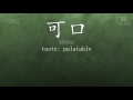 In this video the chinese character is from HSK level 6. And it is "可口", pinyin: "kěkǒu", which means "tasty; palatable".